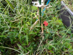左の写真は左下、そして右の写真。どちらもサルビアの赤です。今年は植えていません。つまり草茫々の中で湿気も守られて発芽して来た。私がトマトの世話をしていた梅雨前と梅雨直後にはサルビアは無かったです。