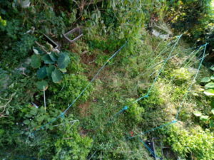 30㎝位にしてどうするか?種をバラまきします。此処まで草茫々にするとどこが畝だか分からない(笑)。通路を掘って土を畝に上げてからのバラマキです。草が30㎝位あるから地面に直接落ちないで、バラバラに落ちます。しかも草があるから直接日光が当たらない。その上から長靴で三度位踏みつければ鎮圧になりますね。土の畝は土寄せ時に上げても好いかな。