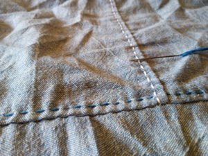 でも、縫物がこんなに面白いものだとは思いませんでしたね。正に嵌まっています。刺し子の太い糸と目の大きな針を使って6-7年やって来たから、縫物が苦ではなくなりました。ミシンを使うべきもの、例えばジーンズとか、もあるとは思うけれど日常的に着て楽しむものなら、手縫いで十分ですね。自分で作ったものであれば収納まで考えて作れます。既製品はそうは行きません。