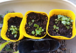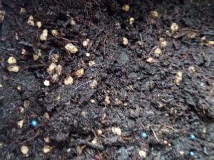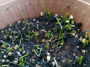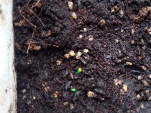 左から岬、ジュエルレッド、タイニーシュシュが表面に上がって来ていました。夢ひびきだけは動きがありません。種は発芽する前に表面に上がって来るんですよ。私は最初、それを知らずに土が流れたのか、と土を掛けていました(笑)。昨日、蒔いたばかりなのに、もう動き出した☺。