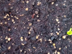 右: トロ箱で芽を出したレッドジュエルです(ラディッシュ)。
