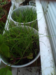 左: 韮の苗ってこんなにも力強いのですね。庭で出ると周りが頑丈そうな植物ばかりだから弱弱しく見えるんですね。