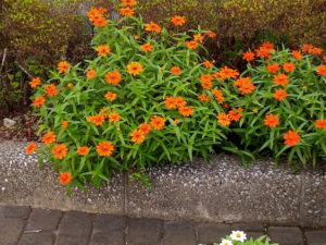 右: オレンジ色のジニア。背丈が低いジニアは我が家の大きいジニアと違うみょくがありますね。