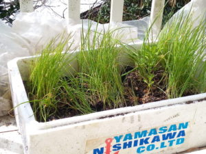 右: 土を入れたトロ箱に移植した万能葱と汐留長葱も葉が立って来ました。活着しましたね。