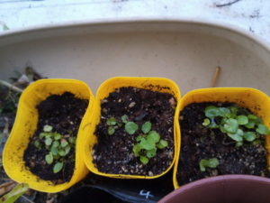 右: トロ箱で芽を出したレッドジュエルです(ラディッシュ)。