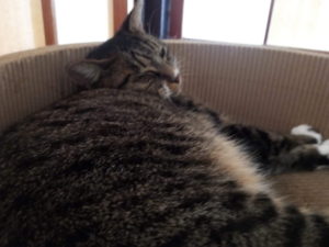 夜中に出掛けたトラ子が帰って来たのは昨日の正午近くでした。帰って来た時はハンティングでもしていたのか、野性味あふれたトラちゃんでしたが、食事をすると臍天で正体もなく眠りこけました(笑)。『家にいる時位、好きなカッコで寝たいよ~!』帰って来て呉れただけで嬉しいよ。