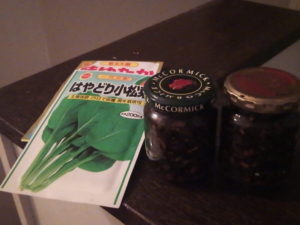 一昨日摘んだ小さめのザル一杯の紫蘇の実を水で晒してアクだしをして、生姜と一緒に佃煮にしました。佃煮ではこの大きさの瓶が便利ですね。一回に食べる量が違うので、ジャムの瓶はこの倍くらいが便利です。種袋から見当をつけると、随分小さいでしょう?