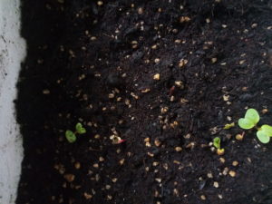 右: ラディッシュ・レッドジュエルは4つ以上発芽しました。下の写真の順番です。