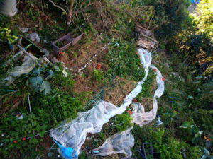数日前に植えたブロッコリー類の苗が心配で不織布を掛けて置きましたが、夕方には強い北風が左手から吹いて、全部庭の右手に吹き寄せられていました。