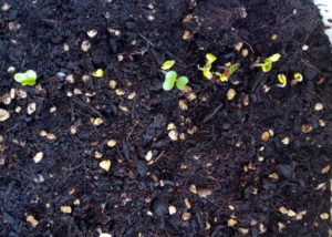 左: 蕪だか大根だかばら撒きにした処です。さて、何の双葉でしょうね。