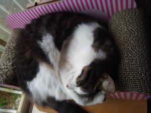 西隣のAさんが刈払い器をガーガーやっているので、トラ子はお隣の物置へ退散し、うめと福は家の二階で寝ています。12時に覗いたら、あれ~っ!?もういない。早々と帰られたのかな。あ、真ん中のお部屋だけ、ガラス窓ですね。未だいらっしゃる。