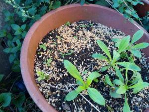 朝より更にハッキリして来たレタスの発芽です。右の写真は尺はある、大鉢なのですが、かすみ草の苗とその向こうには色々蒔いたけれど、草だか花だか分かりません(笑)。