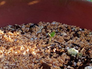 物干しのトロ箱に蒔いたレタスが発芽を始めました。昨日は白い糸くず見たいに根を出していましたが、今日は茎を緑化させています。今年は此処である程度育てて庭に下して行きます。