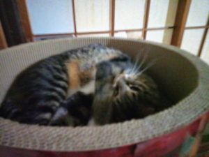その後で猫が入って来ました。福だったら盛り上がっちゃってまずいな、と思いましたが、タイガーさんが昼寝に来ました。タイガーさんの寝ている上に置いてある銀杏を炒らなくっちゃいけないんだった。なんか銀杏を使った料理でもしようかなぁ。