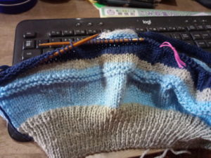 その後、紺色を15段程編み、殆ど灰色に見えますが、薄茶を三段、錆朱を三段、もう一度薄茶を三段編んで、紺色に戻りました。その後は灰色を3段入れて下の水色をさかさまにした状態で入れ、そこから先は灰色一色で編んで行こうかなぁ。