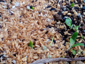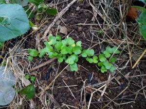右: 味ゆたか大根の発芽です。一番低くて水分が多いからか、日照等の条件は悪い処ですが大きな双葉を見せて呉れました。。
