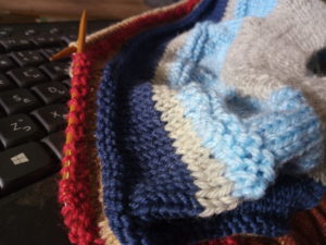 つい手に取るのが昼間でもこちらのベストです。色が柔らかいせいもあり、自分の中で少しだけ工夫しながら編んでいます。単なる横縞ですが、裏編みで立体感を加えると既製品のセーターには無い面白さが出て来ます。