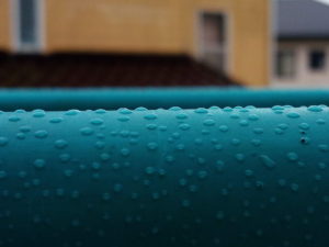 左: 物干し竿に付いた雨滴…夜から雨だったんだっけ。寝ながら物干しの未発芽の小松菜を氣にして居たっけ。朝になって外を見たら、そんな雨の事は頭から飛んで行ってしまっていました(笑)。