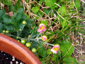 中: 零れ種で頑張って咲いて呉れたニチニチソウ。可愛い色!赤が出るか、と思っていました。