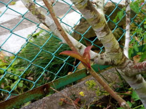 中: ハナカイドウの新芽です。この枝は自分の樹に絡んで伸びています。ハナカイドウって蔓性を少し持っているのかなぁ。いつも実梅の枝に絡んで掴まっています(笑)。常盤台では、もう取り壊されてしまった昭和の家の角で二階まで這い上がるハナカイドウが春になると可憐な花を家の裏壁一面に咲いていました。