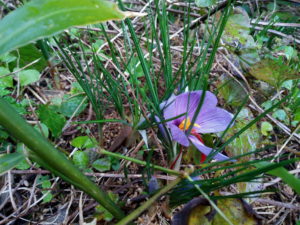 左: サフランの第一花。雄蕊がベロンと雨で下がってしまいました。後で乾いたらガラス瓶に入れて冷蔵庫で保存です。