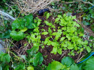 右: 味ゆたか大根の発芽です。一番低くて水分が多いからか、日照等の条件は悪い処ですが大きな双葉を見せて呉れました。。
