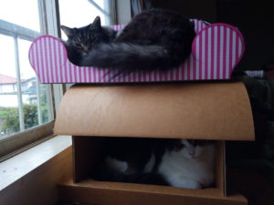 居ました!トラ子のベッドの下にある段ボールベッドに福は陣取っていました。壁に覆われていて暖かい、と判断したのでしょう。