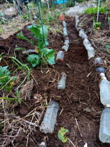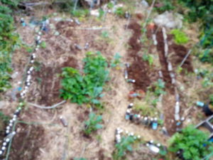 写真は呆けたけれど、一畝が真っ直ぐになりました。二畝の通路を修正して今日はお終いです。右下手前に見えるジャガイモプランターに二週間位前にニジュウヤホシが付いていたので、処置しました。その後、順調で虫喰いも無くなりました。今日は茎が大分長くなって来たので、土と籾殻を入れました。これから活性希釈液を流しこみます。