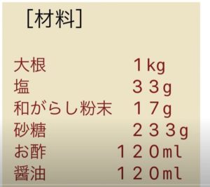 大根の漬物…確か群馬県とか言っていたな。ジップロックで作るんですよ。潮で下漬けした大根の汁を切って調味料を混ぜて一日。この御宅ではお祖母様直伝の漬物らしいです。