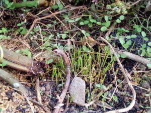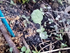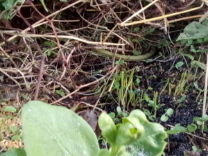 こうして写真で見ると凄く山奥の畑みたいですね。お隣の黒マルチに出た大蒜の芽の緑が強くなってマルチが抹茶の様な色に見えます。