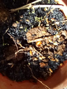 今日はNo.2堆肥枠の分解です。これは柿の木の影に持って行こうかな。ジャガイモプランタ―を横に並べ、その内の未だ小さめのジャガイモをNo.1堆肥枠跡へ移動させてみようかしら。