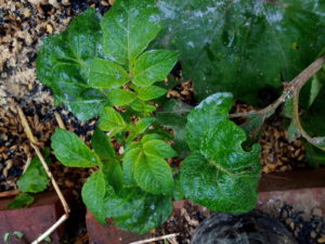 ジャガイモの新芽が二つ出ました。これで7つ?右の写真は私の大好きなジャガイモの、緑の炎です。他の人はそんな風には感じ無いかも知れませんが、いつも