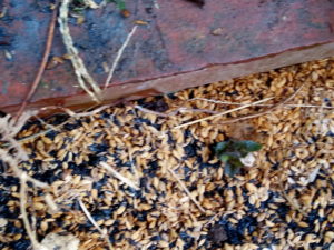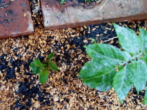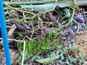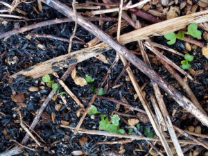 通路に植えたジャガイモの端に置いた五号駄温鉢…何を蒔いたか忘れて何でも突っ込んでしまって居ます。何も蒔いていない、と思っていました。昨日見た時は黒い燻炭しか見えなかったから次郎柿の種二つをグイッと押し込んで置いたら、今朝、猫草(燕麦)がツンツンとでていました(笑)。真ん中辺に見えているのが柿の種ですね。