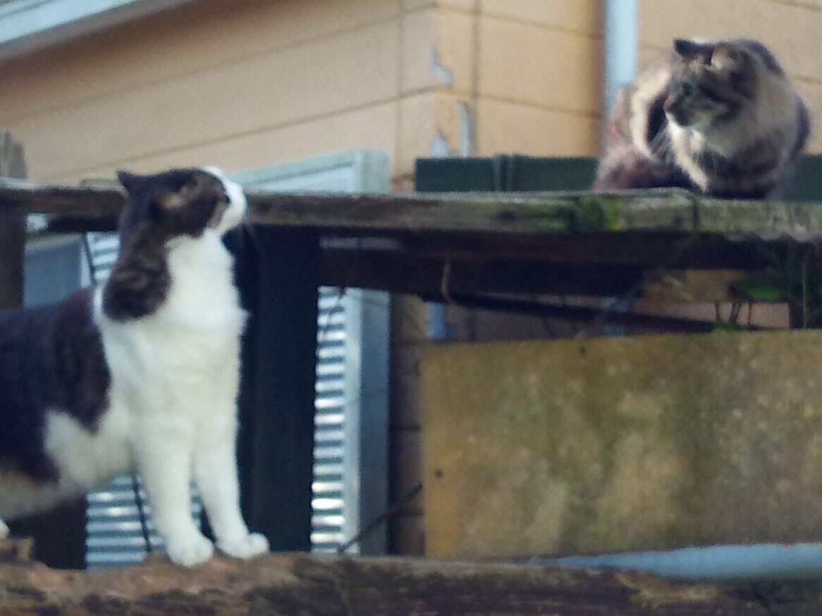 私が言葉で後ろに黒ちゃんが居て、アンタの事を狙っているよ!、と言ってもへらへらしていた(笑)。福は私の横に居て、屋根の上の出来事をジッと見ていた。福と黒ちゃんは同じ母猫から一年違いで産まれました。福は雄で黒ちゃんに昔から言い寄っているけれど、黒ちゃんは雌の敏感さから、福とは血がつながっているのが分かるのか、福を雄としては認めていない。つまり、福は黒ちゃんに嫌われているのだ。
