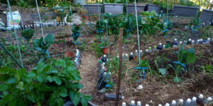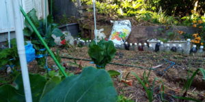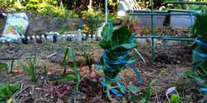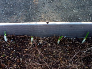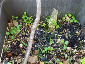 右: 今年集めた韮の種は風に守られて発芽が盛んです。