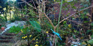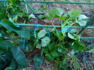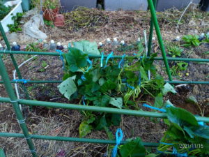 地面に広がっていたサツマイモは3月に伏せ込んで、その挿し穂を6月以降に挿したものなので、市販の刺し穂を収穫した時、未だお芋は小指位しか出来ていませんでした。まさか自分がこれをするとは思いませんでしたが、サツマイモを空中に誘引です。面白そうだ、とは思いましたが、面倒臭いから私はやらない、と思っていました。これもDOHO STYLEだったんですね。地面が見えた事と葉っぱの上を飛ばないで済むのが好いですねぇ。