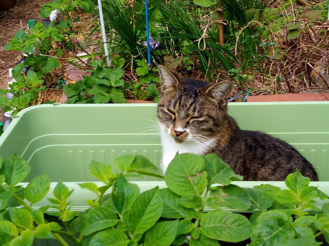うめ『オカアシャンは新しいプランターを買ったけれど、昨日からずっと庭に置きっぱなしなのよ。ワタシが入ってみたら、好い具合に落ち付けるのね。丁度午前中は日が当たるから晴れた日には恰好の日向ぼっこの場所になるわね。勿論、オカアシャンがプランターに土を入れる前だけの楽しみだけど。