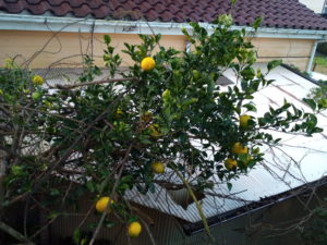 左: 日毎に黄色くなる夏蜜柑です。正確には地元の夏蜜柑ではありません。山口県か広島県から取り寄せた夏蜜柑が美味しかったので、30年位前に種を蒔き、7本発芽した内、生き残った一本です。