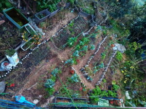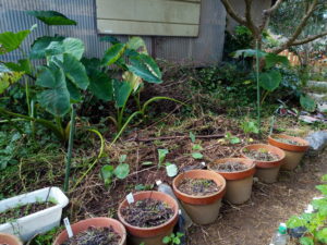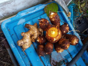 右: キャベツを植えようとしたら、根生姜と海老芋が出て来ました。ま
