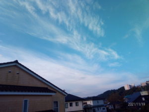左: 西南西からは高層で白い綺麗な雲が東へ伸びていました。