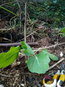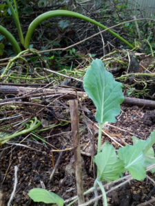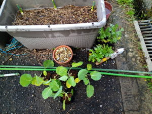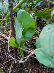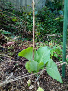 キャベツ金系201号を5株買い、植えつけました。発芽してから茎が曲がり癖が既についているのでキャベツの南側に支柱を立てました。四番目の苗は曲がりが激しくて茎に対して真っ直ぐに支柱を付けましたが、葉が地面を向いてしまいます。このキャベツ達はトンネルはしません。後二週間位で紋白さんも居なくなるでしょうから毎日見回りをして、葉が寝ない様にします。