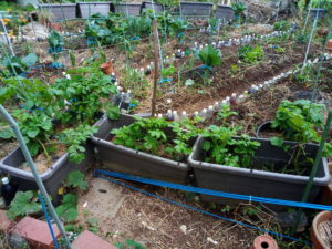 最初に玉葱を植える場所の設定と少し違ったので、燻炭を買ってもう一度撒こうかな。四畝は燻炭がたっぷりしているので、今でも畝が黒っぽく写ります。今日は結わえていない大蒜を結わき、キャベツと春菊を植えます。