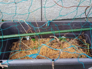 大蒜の葉は一番下で二本の紐に挟みましたが、既にかなり葉が長くなっているので、もう少し高くに結わえ直しました。
