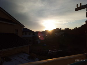 今朝は原っぱも白っぽくなって霜が降りたか、と思う位でした。良く見ると葉に雨滴なのか、沢山着いていました。朝から西隣さんの方角でヒッ、ヒッというジョウビタキの声が聞こえていました。西隣さんの落花生を狙ったのか、烏が二羽で来ていました。