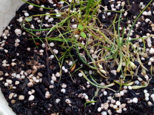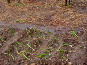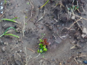 右は玉葱です。起きて来ていますよ。実際には起きるのでは無くて新しい葉が出てオーキシンの作用で根っ子が確りと上部を支えて起き上がります。