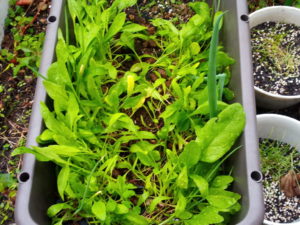 左: これは虫害を受けてしまった芽キャベツ。中: キャベツ苗と春菊苗。右: ホウレンソウが雨風で北側に倒れていましたので、真ん中で左右に分けました。後で紐を張り、立たせます。