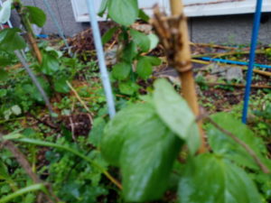 左: これはキャベツです。何と言う品種かは覚えていないのですが、7月の終わり位に購入して物干しで育てて来ましたが、地植えした途端に虫に遣られて痛々しい姿で写真を撮っていないのかも知れません。根元にはヨトウも居なかったので、バッタの虫害だったのでしょうか。数日前から支柱に結わえた辺りから復活を始めました。単に虫害する虫が死んだ、という事もあり得ますが。