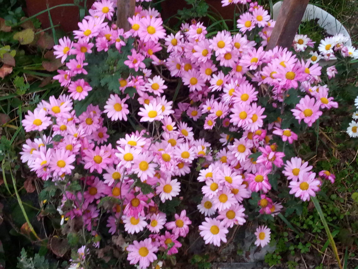 未だ、私の知識は浅いのですが、この垂れた菊を少し上向きにしたら寿命も長くなるのでは、と思い、麻紐で括ってみました。すると後から咲いて来た花の色が一段と濃いのです。一週間前の14日辺りの写真では未だダラリと垂れていますから、それ以降、縛った様です。動画を見れば見える程、本を読めば読むほどに、今までの植物に対する”常識”がドンドンと崩れて行きます。
