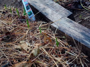 右: 玄関前のホウレンソウです。未だそれ程大きくは育って居ませんが、種の密植で込み合っています。明日辺りに少し間引いて玉子焼きにでも入れようかな。プランタでホウレンソウを作りたい、という人が居らしたので、ホウレンソウも少し背丈が高くなって来たので、二本の麻紐に挟んで垂直にしてみました。序にこのプランターの主である皐月さんを支柱に括りつけてみました。オーキシンが働いて呉れると嬉しいなぁ。