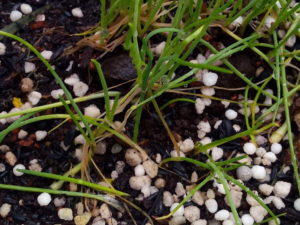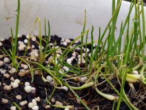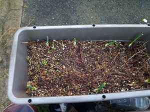 右は玉葱です。起きて来ていますよ。実際には起きるのでは無くて新しい葉が出てオーキシンの作用で根っ子が確りと上部を支えて起き上がります。